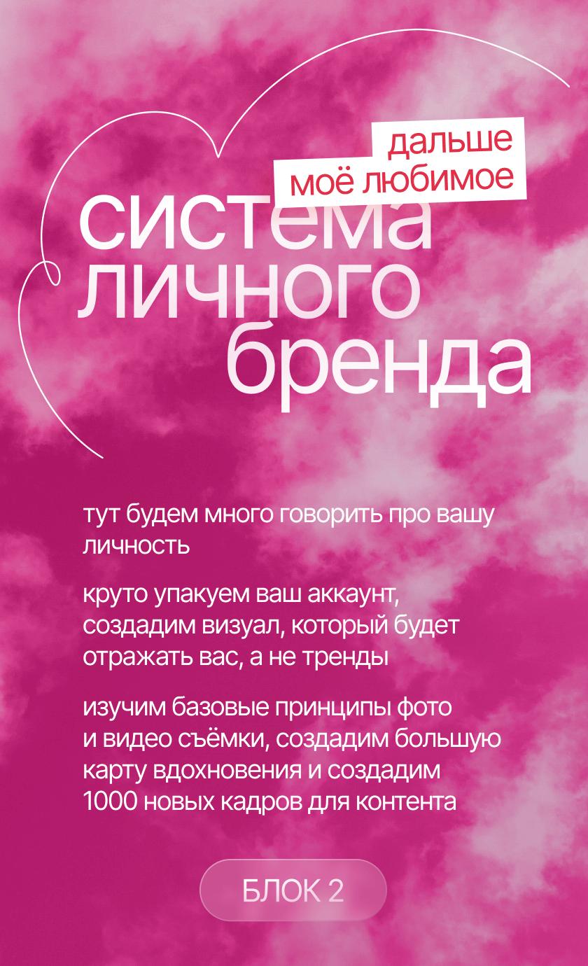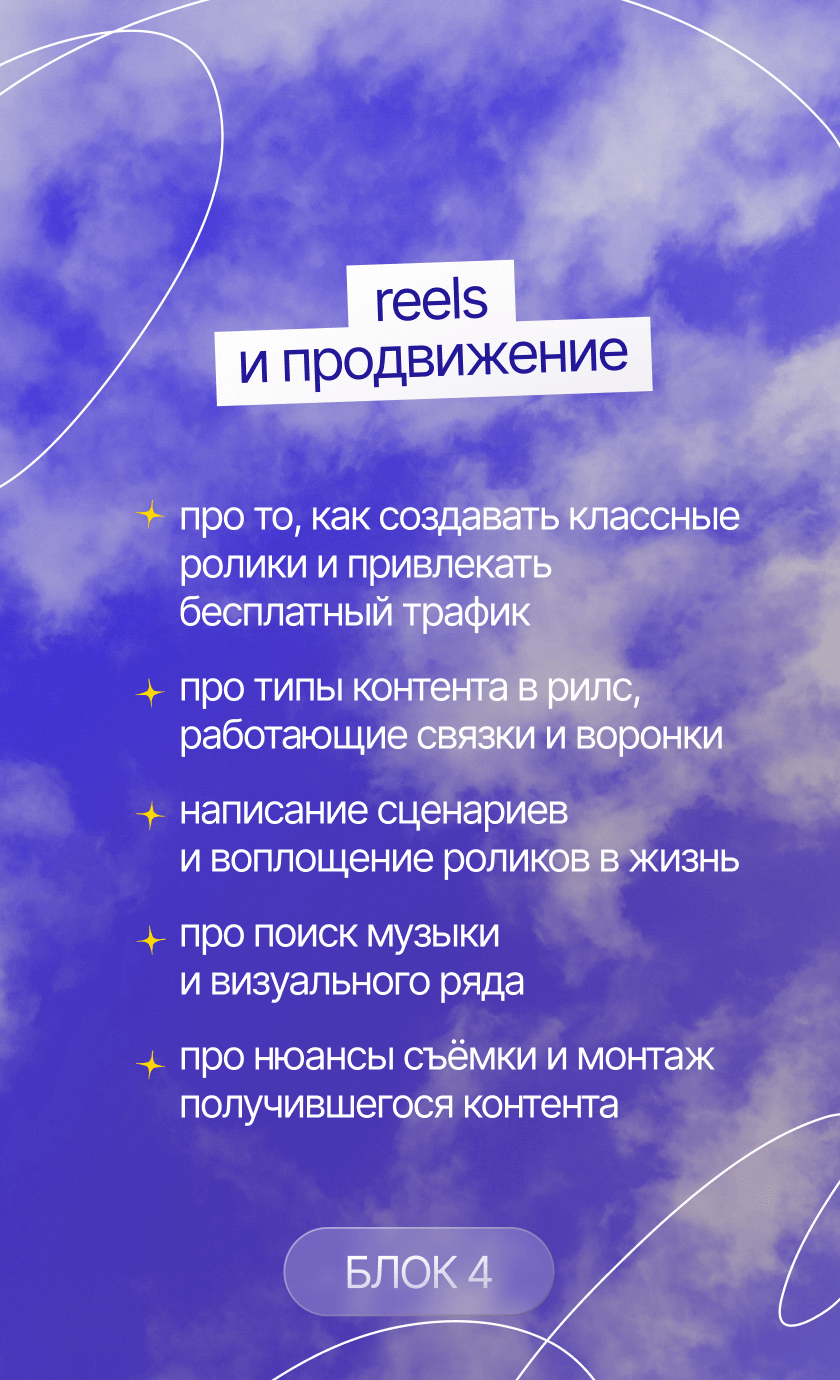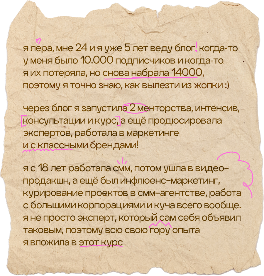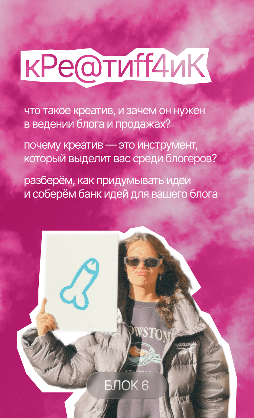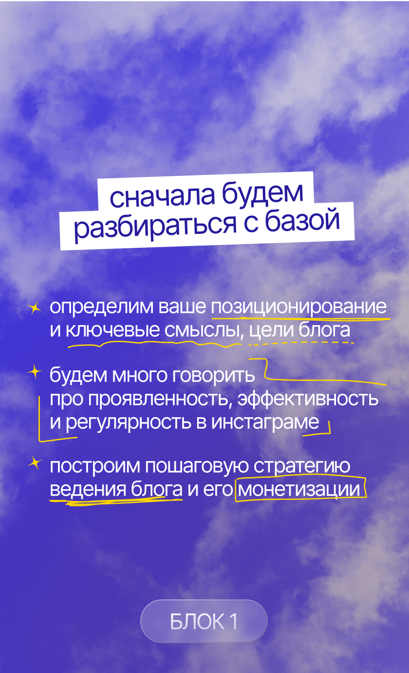 начнешь системно вести блог, построишь стратегию развития твоего аккаунта, научишься делать клевые и креативные сторителлинги, на которые аудитория наконец начнет реагировать, а твой контент станет таким, который обычно сохраняют на пинтересте. начнешь зарабатывать с помощью блога и попробуешь себя в работе с брендами. мой курс — это работа 50/50, я даю все необходимые инструменты, поддержку и создаю классное комьюнити, а ты действуешь и внедряешь все в свой блог :)