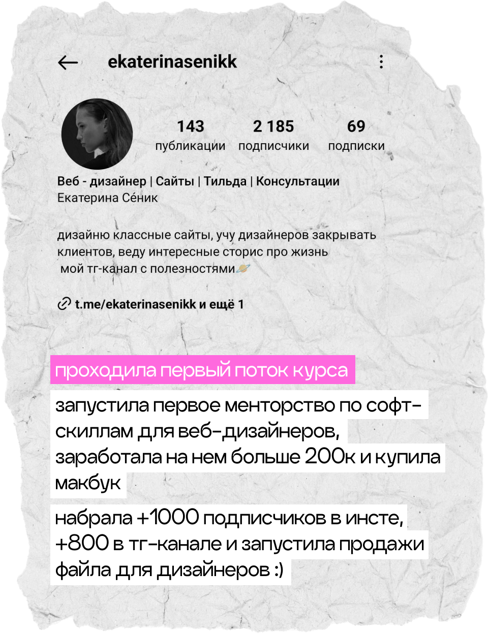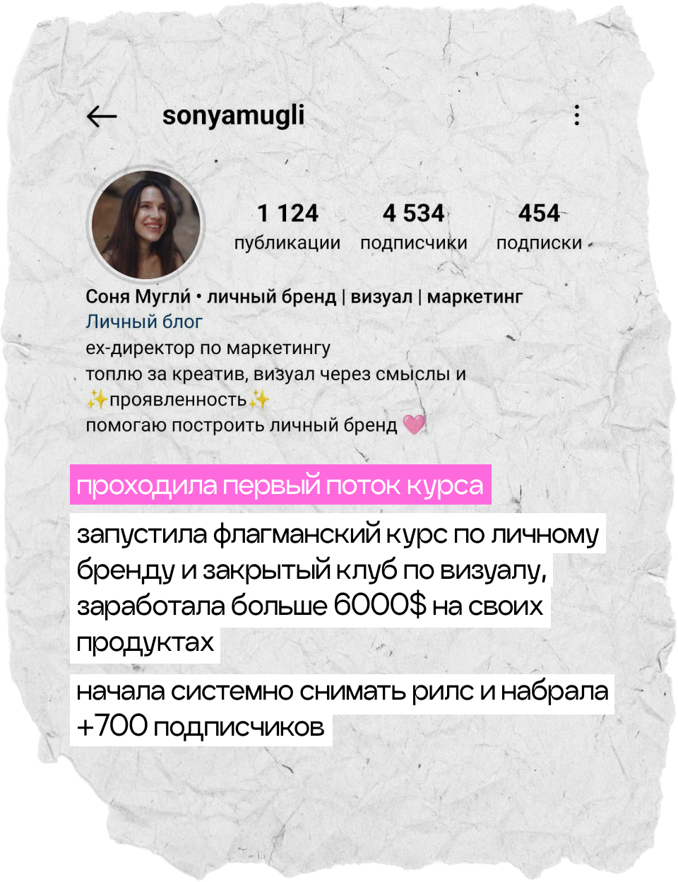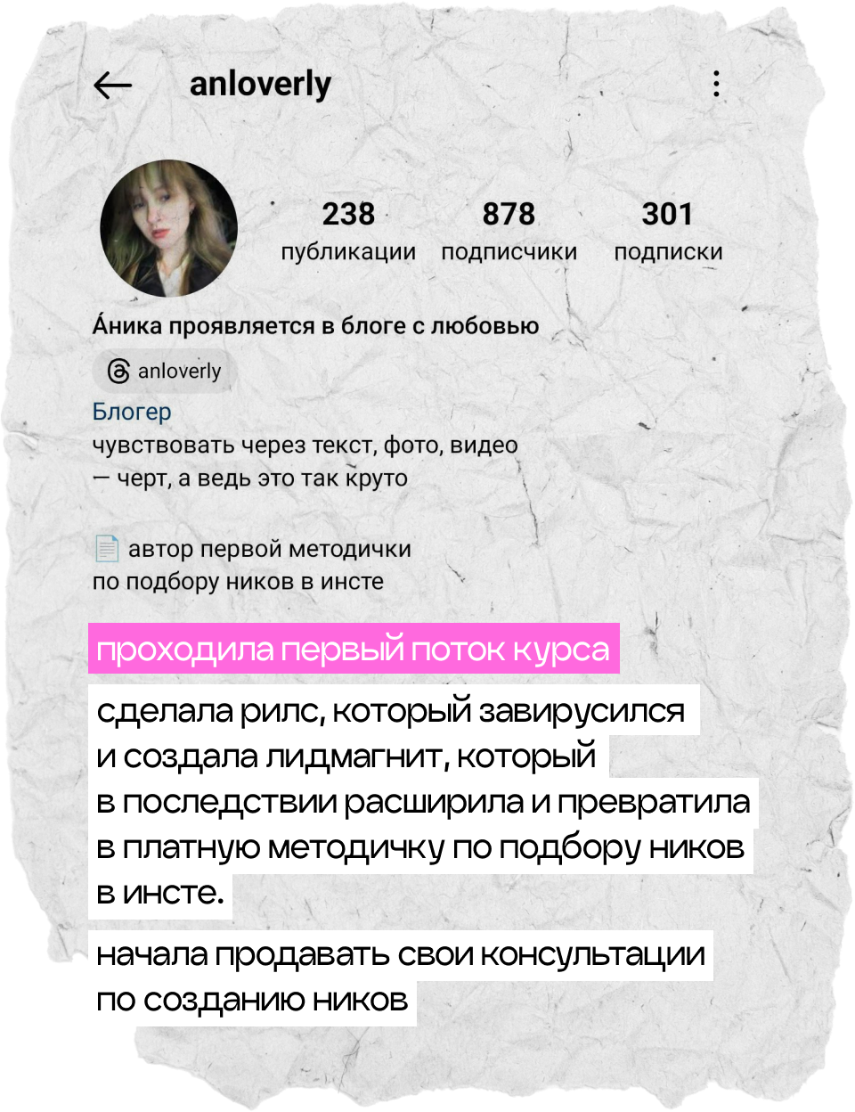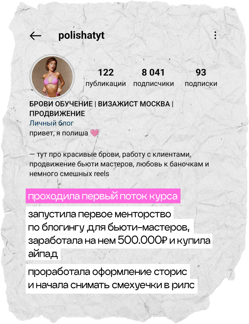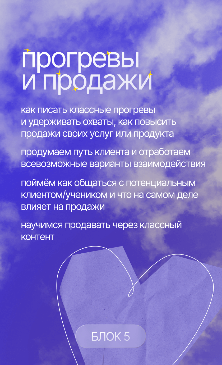 начнешь системно вести блог, построишь стратегию развития твоего аккаунта, научишься делать клевые и креативные сторителлинги, на которые аудитория наконец начнет реагировать, а твой контент станет таким, который обычно сохраняют на пинтересте. начнешь зарабатывать с помощью блога и попробуешь себя в работе с брендами. мой курс — это работа 50/50, я даю все необходимые инструменты, поддержку и создаю классное комьюнити, а ты действуешь и внедряешь все в свой блог :)