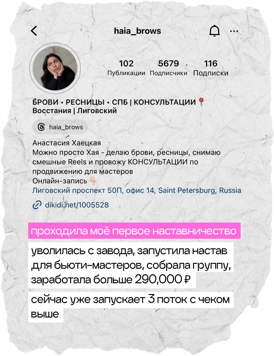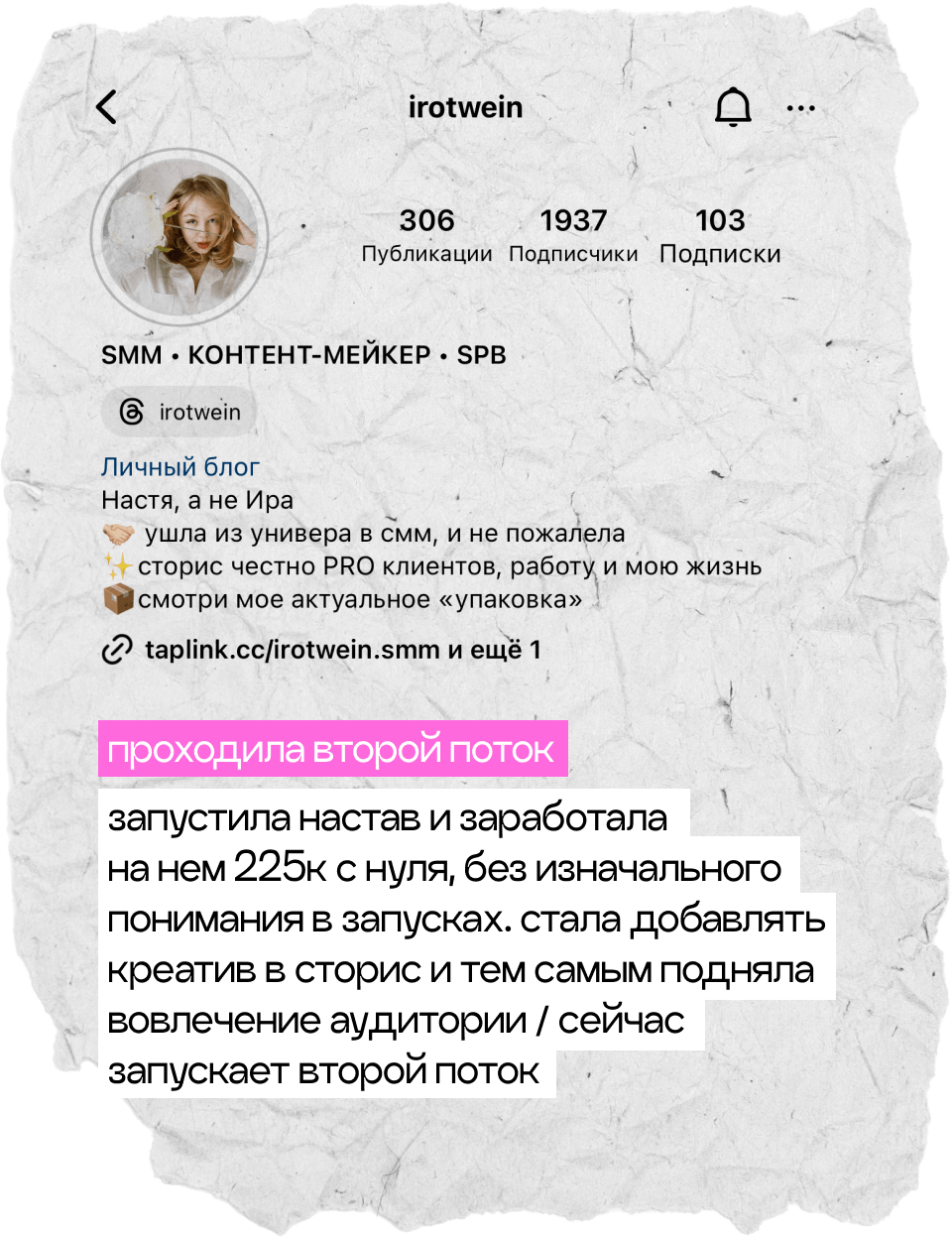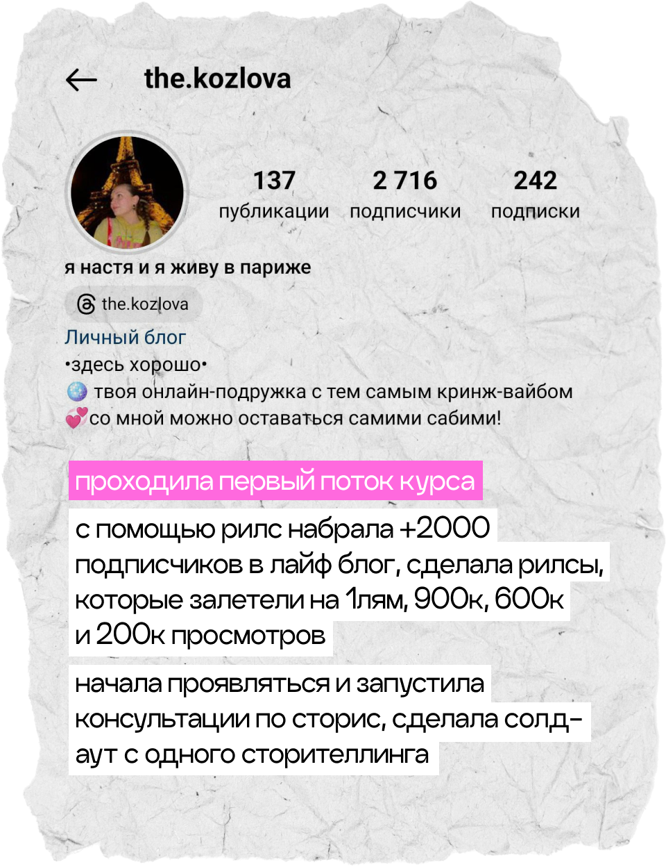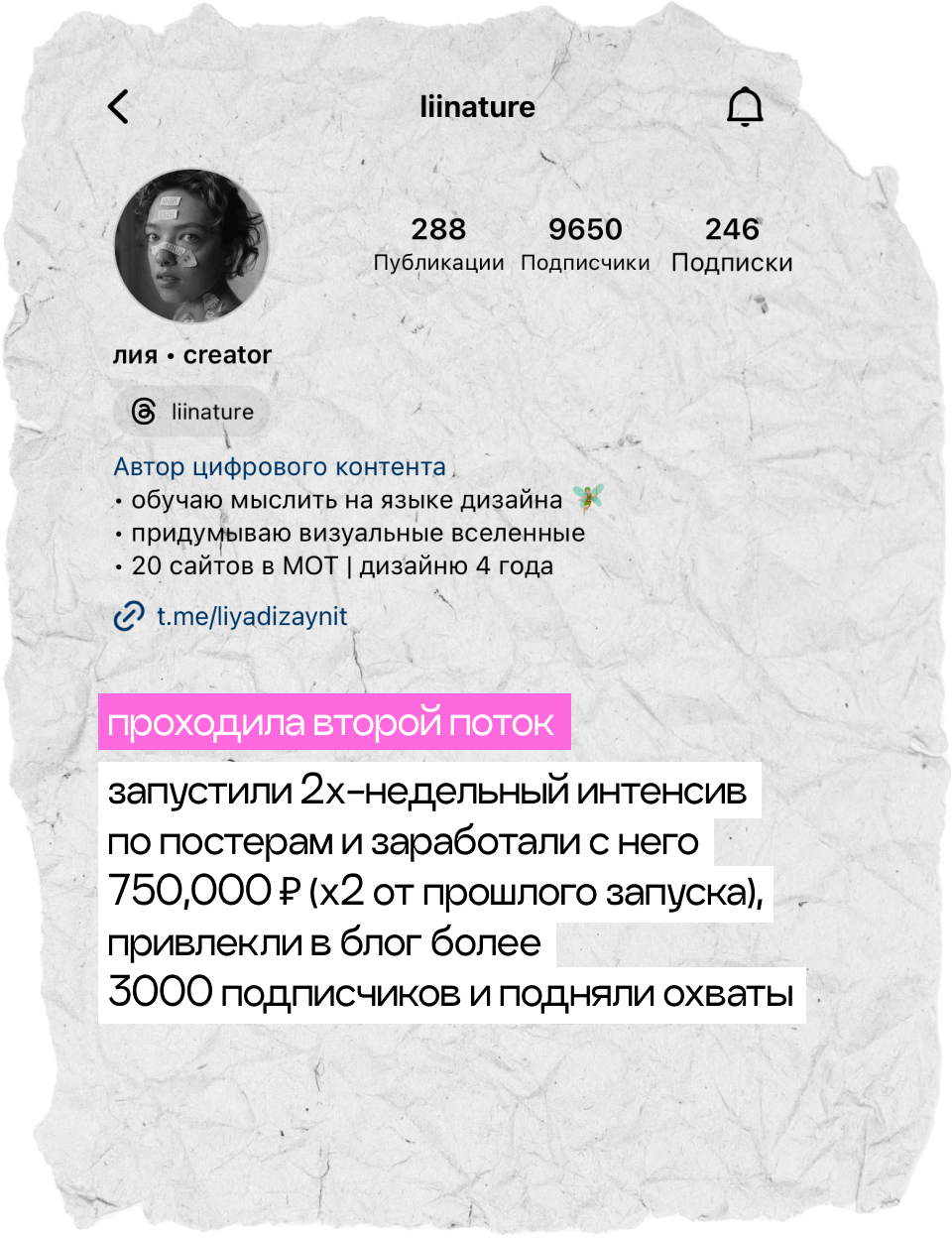 начнешь системно вести блог, построишь стратегию развития твоего аккаунта, научишься делать клевые и креативные сторителлинги, на которые аудитория наконец начнет реагировать, а твой контент станет таким, который обычно сохраняют на пинтересте. начнешь зарабатывать с помощью блога и попробуешь себя в работе с брендами. мой курс — это работа 50/50, я даю все необходимые инструменты, поддержку и создаю классное комьюнити, а ты действуешь и внедряешь все в свой блог :)